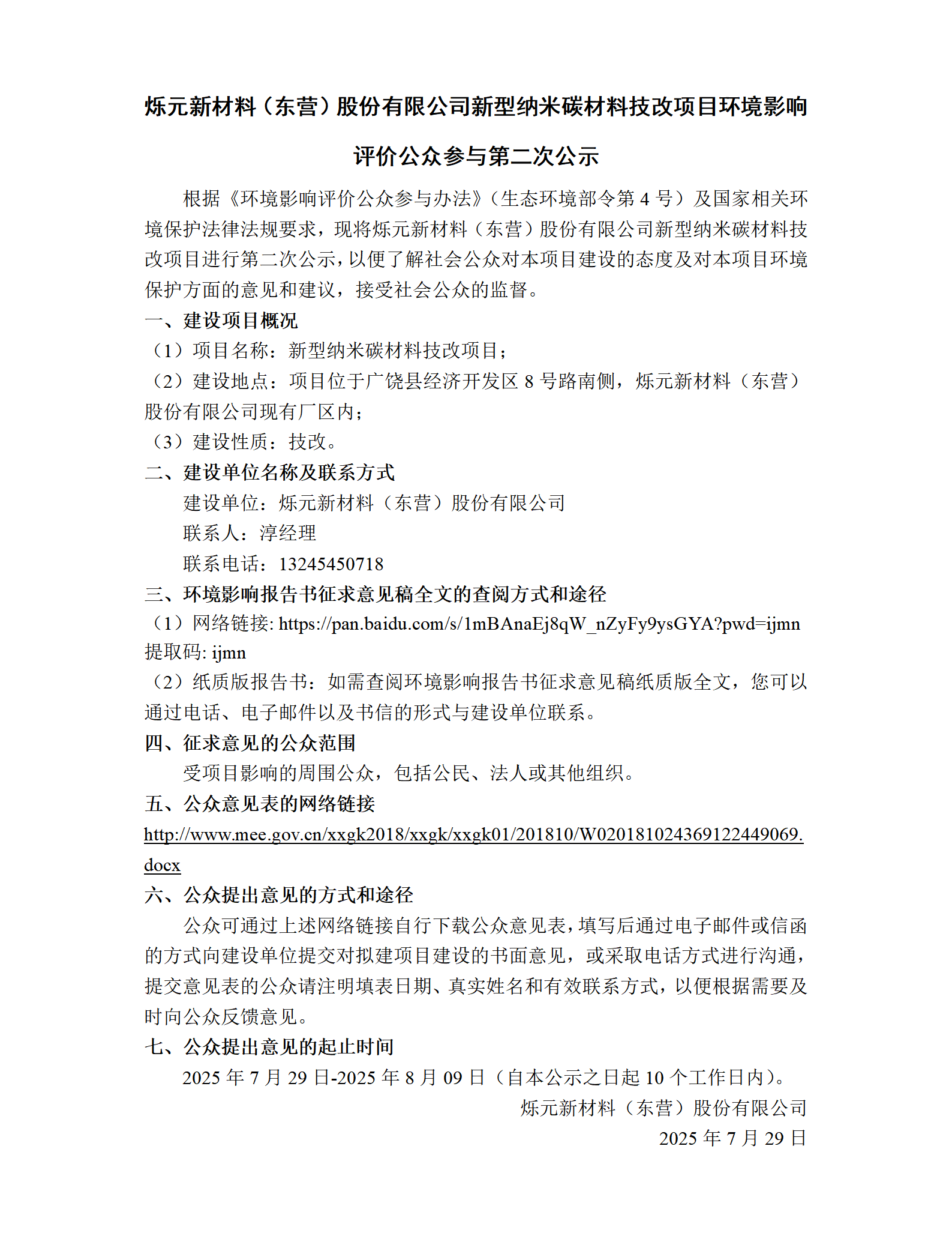 烁元新材料(东营)股份有限公司新型纳米碳材料技改项目环境影响评价公众参与第二次公示